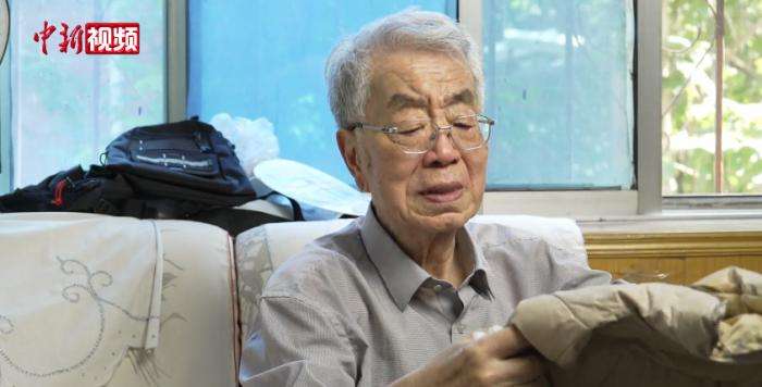 日本遗孤大原朋二拿着养母衣服,潸然泪下。(视频截图)