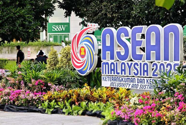 图为10月26日在马来西亚吉隆坡街头拍摄的东盟峰会标识。(图/新华社)