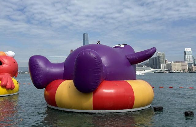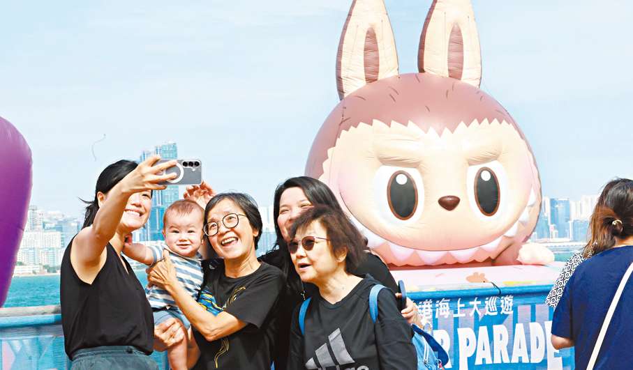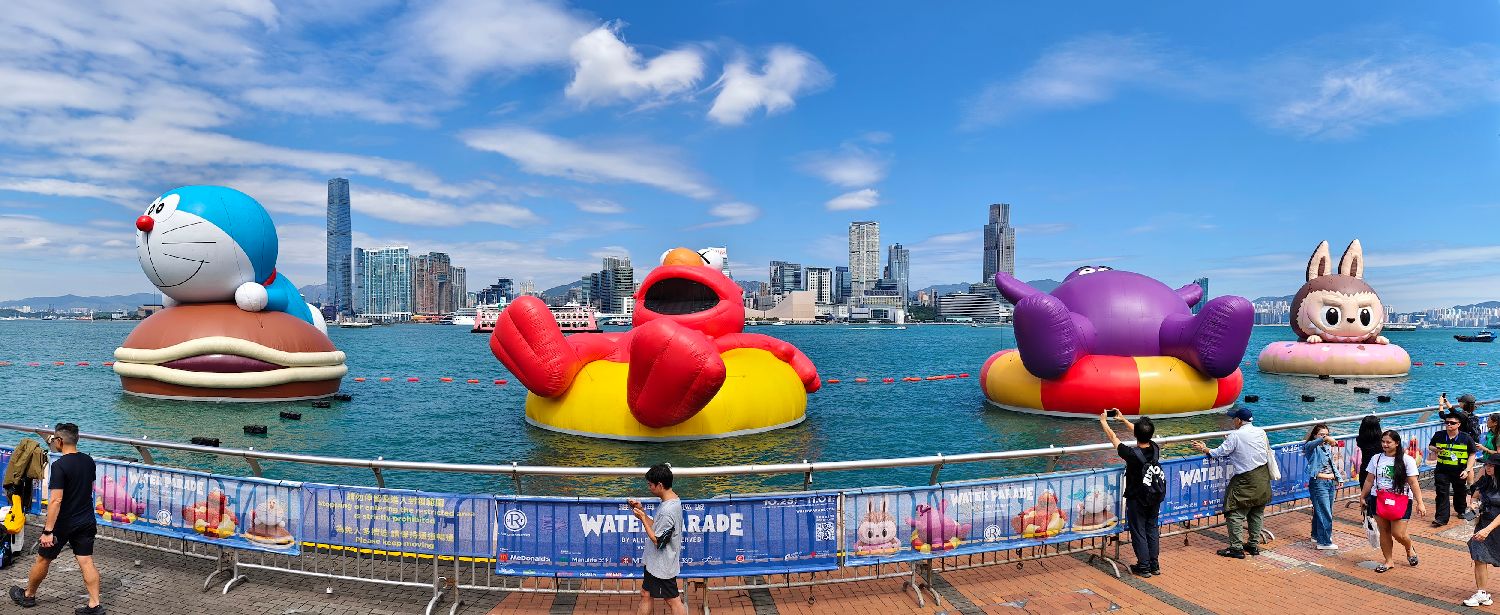 10月26日,一支特殊的“动漫天团”惊艳亮相香港维多利亚港,成为市民与游客争相“打卡”之处。“维港海上大巡游”活动25日起亮相香港金钟添马公园海滨,4个备受欢迎的巨型充气公仔包括哆啦A梦、KAWS & 芝麻街(Elmo)、滑嘟嘟及LABUBU在维港展出,与维港的摩天背景交相辉映,瞬间点燃了整座城市的热情,成为全城焦点。图为四大充气雕塑漂浮在维港海面。(中新社)