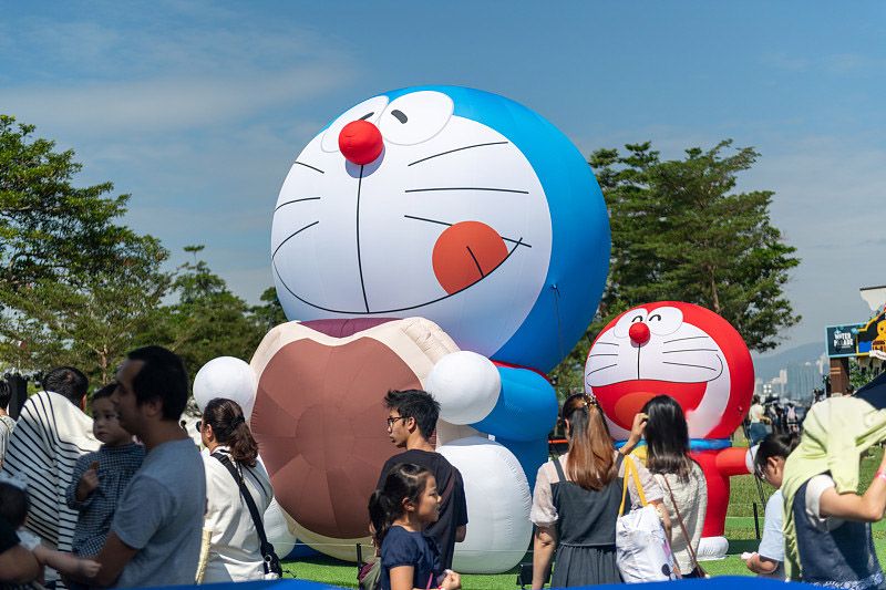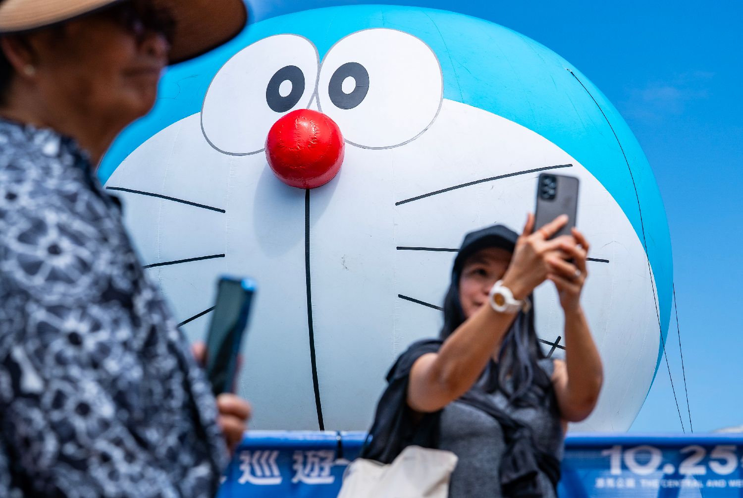 10月26日,游客戴着哆啦A梦头套与哆啦A梦大型充气雕塑合影。(香港中通社)