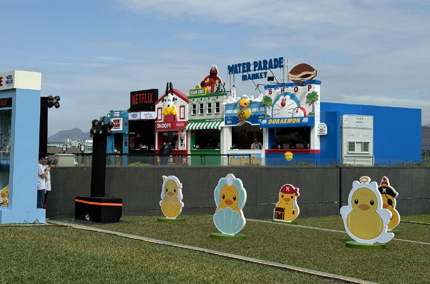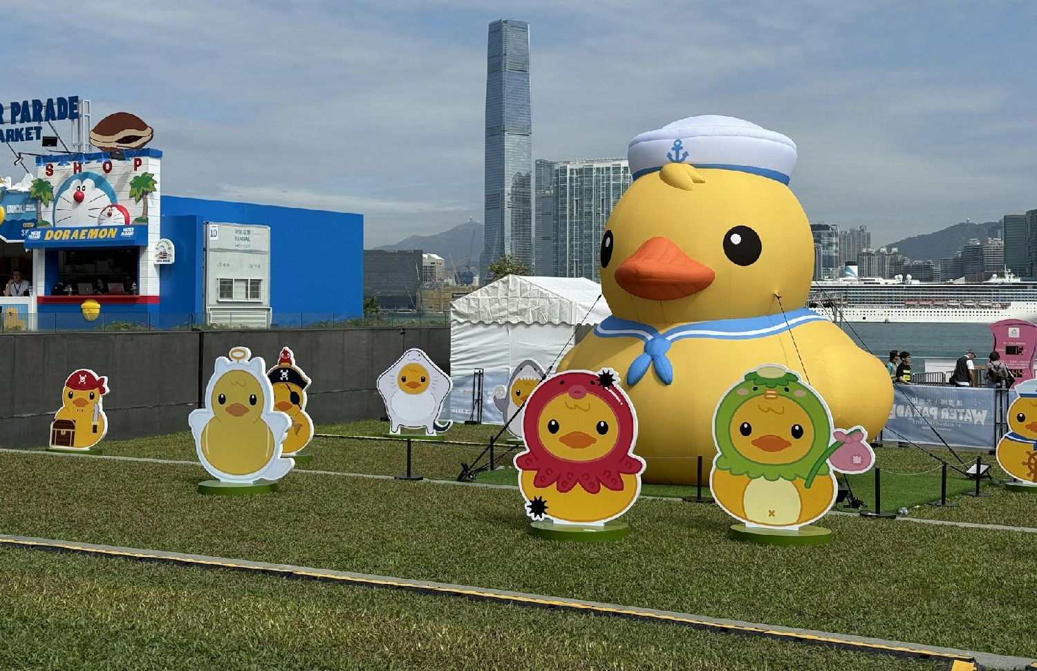 香港海滨长廊的巡游市集上,设有大黄鸭打卡装置。(香港01网)