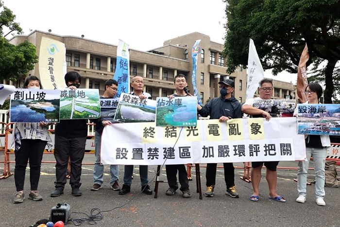 全台多地的环保团体27日集结于台当局行政机构前举办记者会,呼吁扭转当前光电乱象。(图/台北《联合报》)