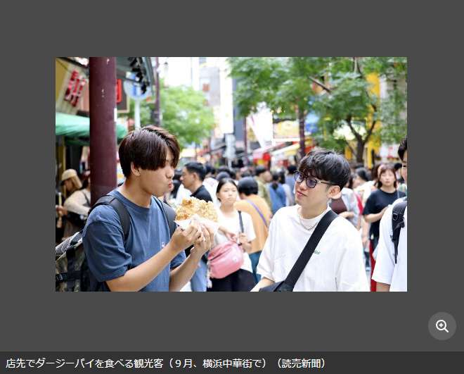 图为9月在横滨中华街拍摄的正在吃大鸡排的游客。(图/《读卖新闻》报道截图)