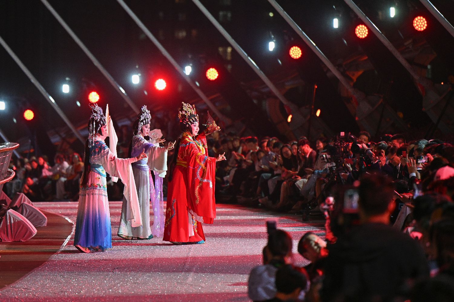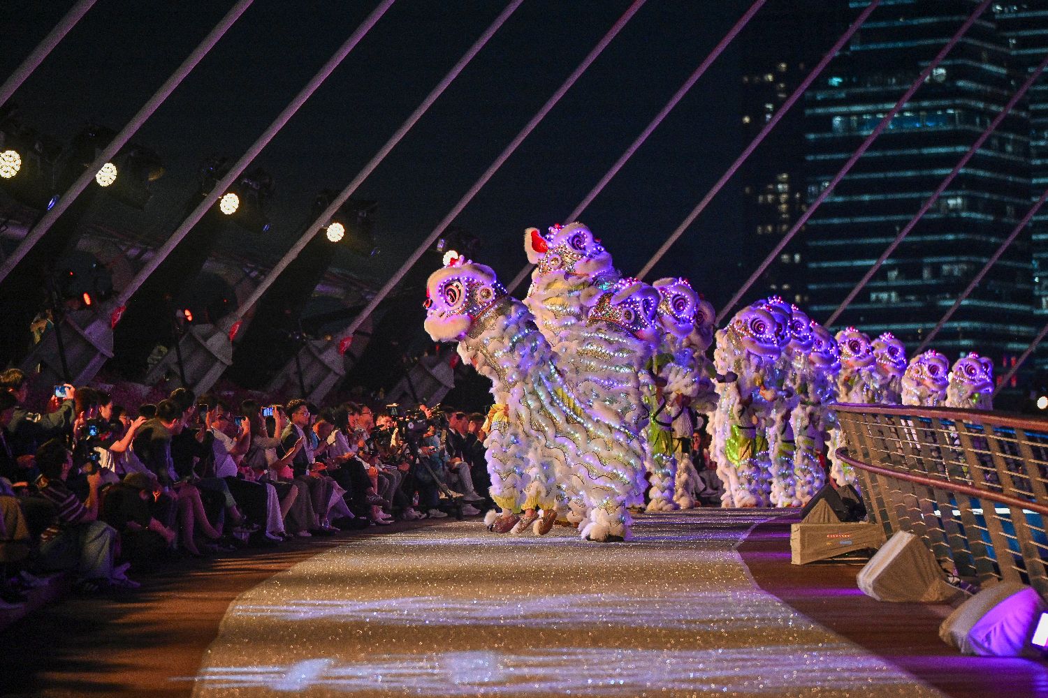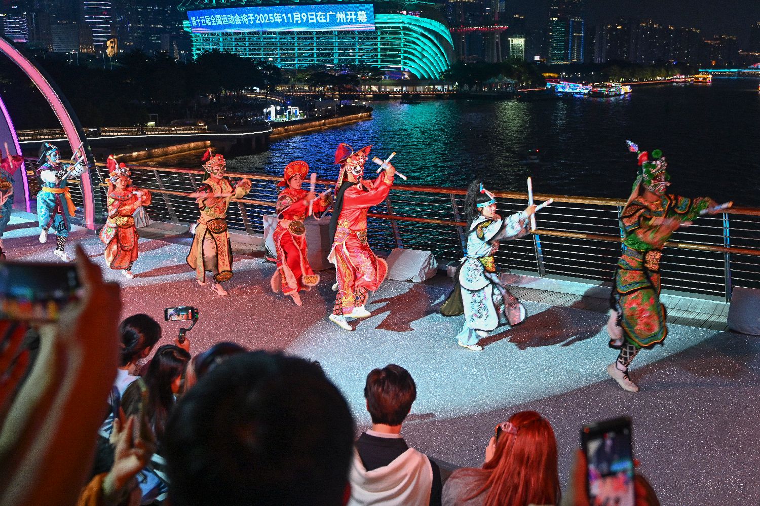 10月29日,珠江之畔霓虹闪耀,198米长的海心桥化身巨型T台,上演了一场融合科技与时尚的视觉盛宴。作为迎接中国第十五届全国运动会(简称“全运会”)的主题活动,“广州之夜”以海心桥为秀道、广州塔与珠江为背景,融合全运会元素,通过时装走秀、歌舞民俗表演等节目正式点亮了全运会的倒计时。图为活动中的歌舞表演。(中新社)