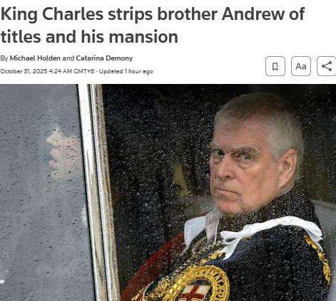 英国国王查尔斯三世已启动正式程序,剥夺其弟安德鲁王子的尊号、头衔及荣誉,并已通知他搬离王室住所。(图/路透社报道截图)