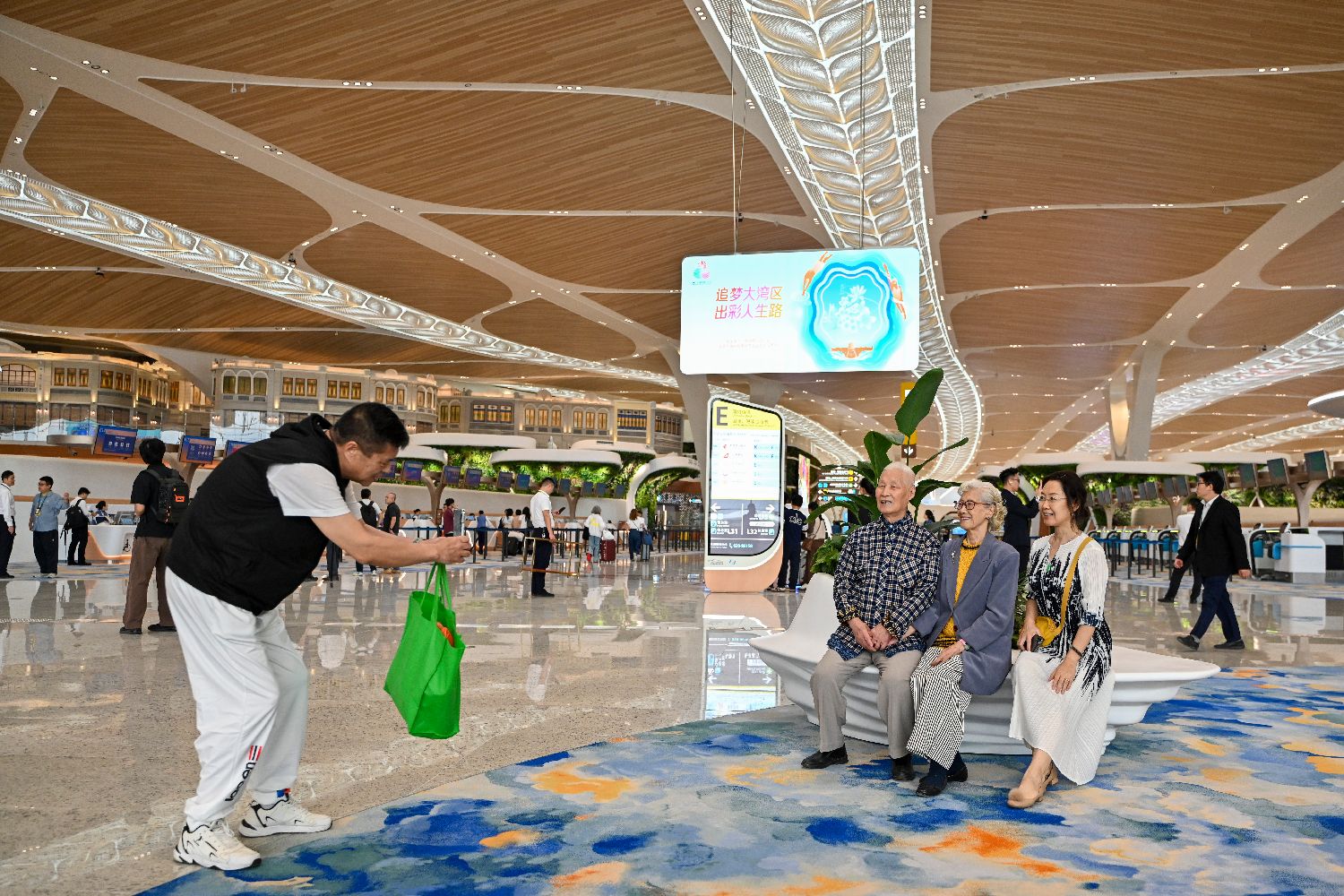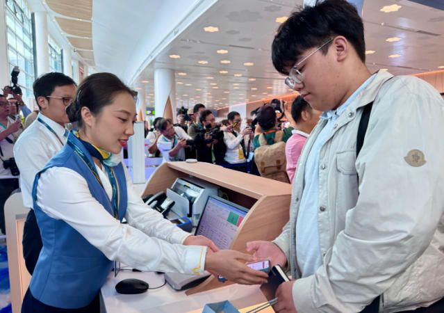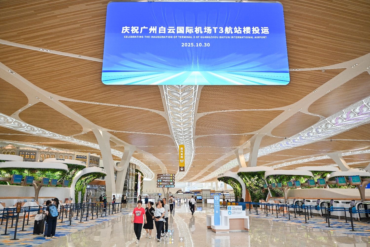 10月30日,广州白云国际机场T3航站楼和第五跑道正式投运,开启“五条跑道+三座航站楼”运行,成为中国民航首个拥有五条商用跑道的机场,枢纽能级再跃升,助力粤港澳大湾区世界级机场群加速形成。图为搭乘首航旅客检票登机。(人民网)