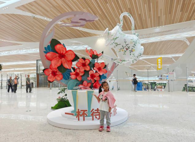 T3航站楼岭南风格浓,小朋友与“一杯待客茶”装置合影。(人民网)
