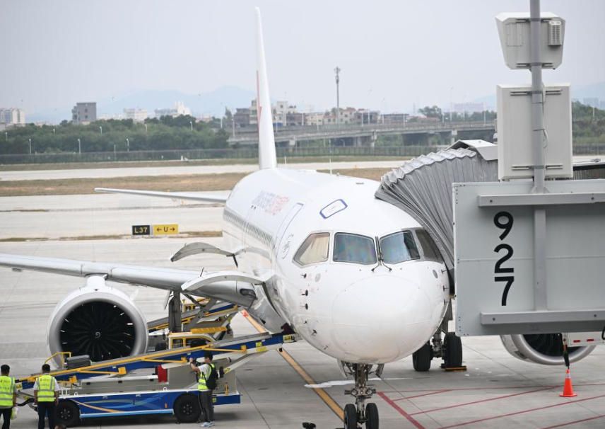 10月30日,在广州白云机场T3航站楼,首航航班东方航空MU6308在做起飞前工作。(新华社)