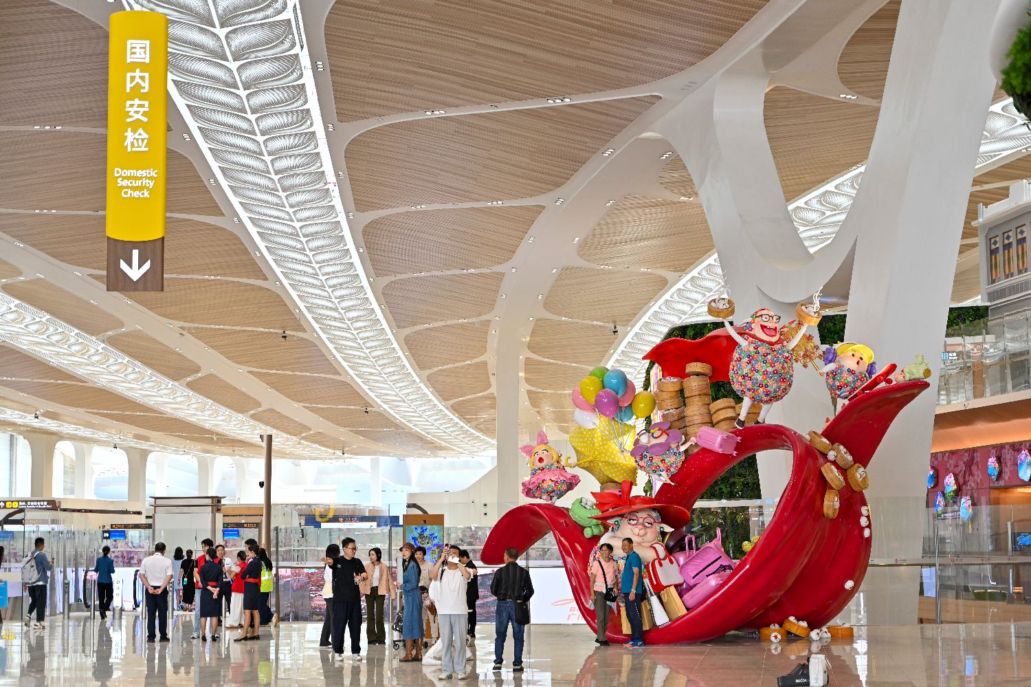 图为T3航站楼内的广州美食主题艺术装置吸引旅客。(中新社)
