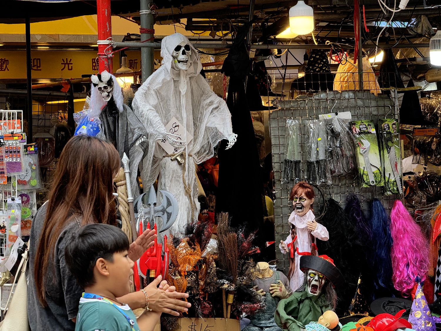 10月30日,中国香港市民带着小孩到深水埗福华街(俗称“玩具街”)选购各式各样的万圣节面具和服饰。(香港中通社)