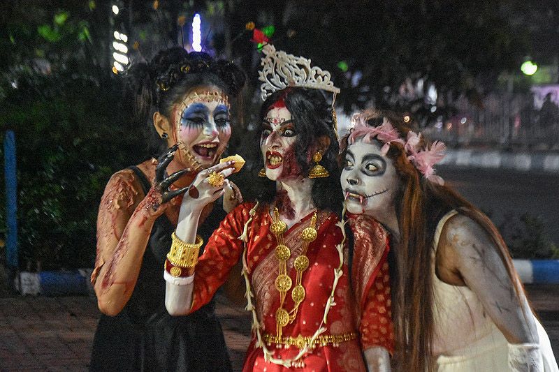 10月30日,印度加尔各答,人们打扮成各种鬼怪的模样,参加万圣节前的装扮比赛并合影。(CFP)