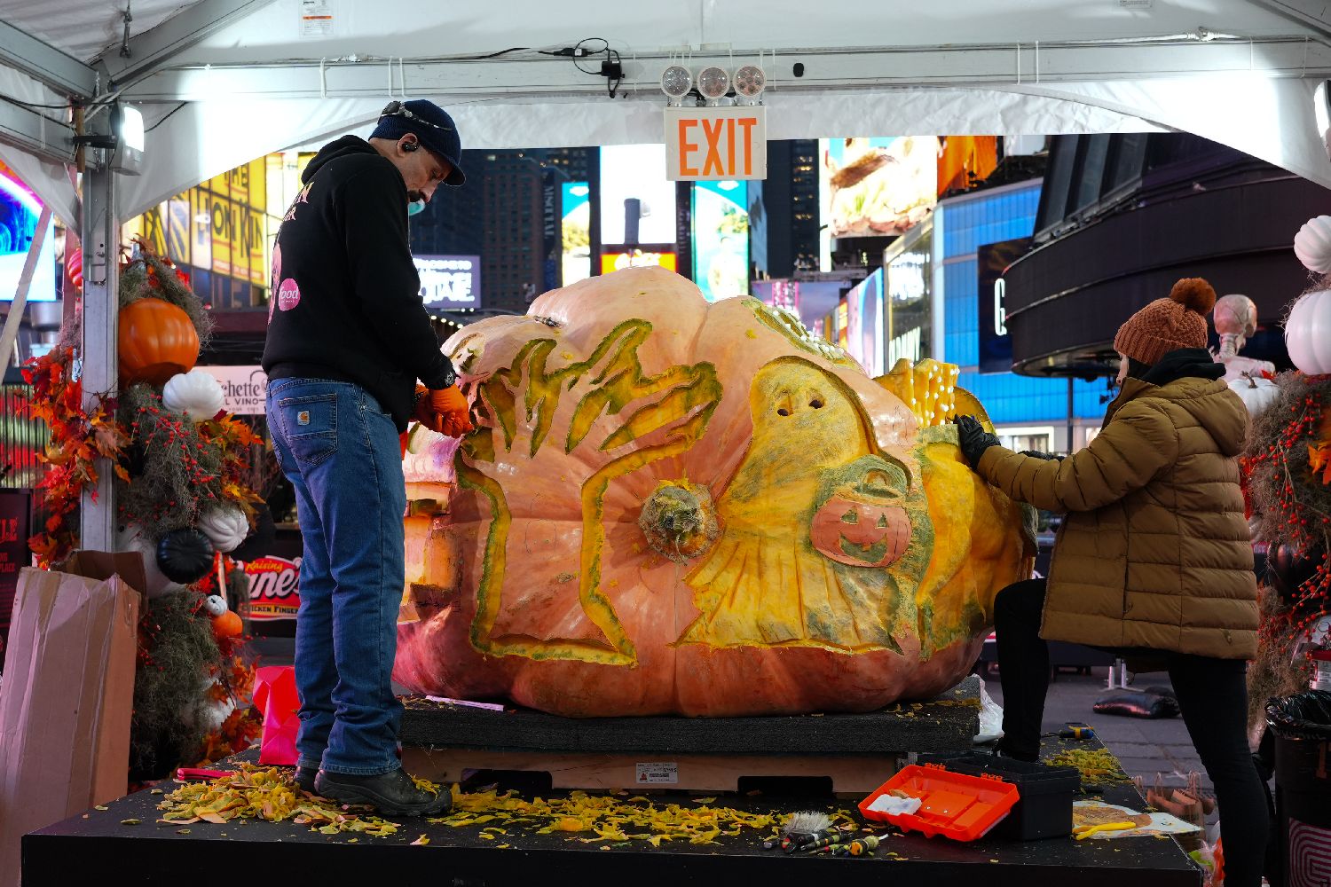 10月29日,美国纽约时报广场一个万圣节主题的景观,雕刻师正在雕刻万圣节巨型南瓜。(中新社)