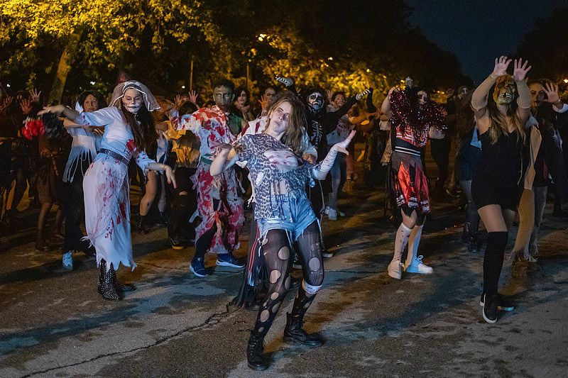 10月30日,西班牙马德里,万圣节前夕,几名装扮成僵尸的女性在丽池公园参加快闪活动,她们随着迈克尔·杰克逊的歌曲《颤栗》的节奏跳舞。(CFP)