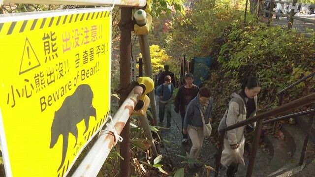 鸣子温泉的鸣子峡沿着峡谷分布着枫树、漆树和黄连木等植物,如今已被染成红黄相间的绚丽景色,正是观赏红叶的最佳时期。但与此同时,市内多次出现熊的目击事件,大崎市于上月28日发布了“熊出没紧急事态宣言”。因此,在游步道入口处,市政府张贴了带有熊插图的警示纸张,除了日语外,还用英语、中文和韩语书写,提醒外国游客提高警惕,注意安全。