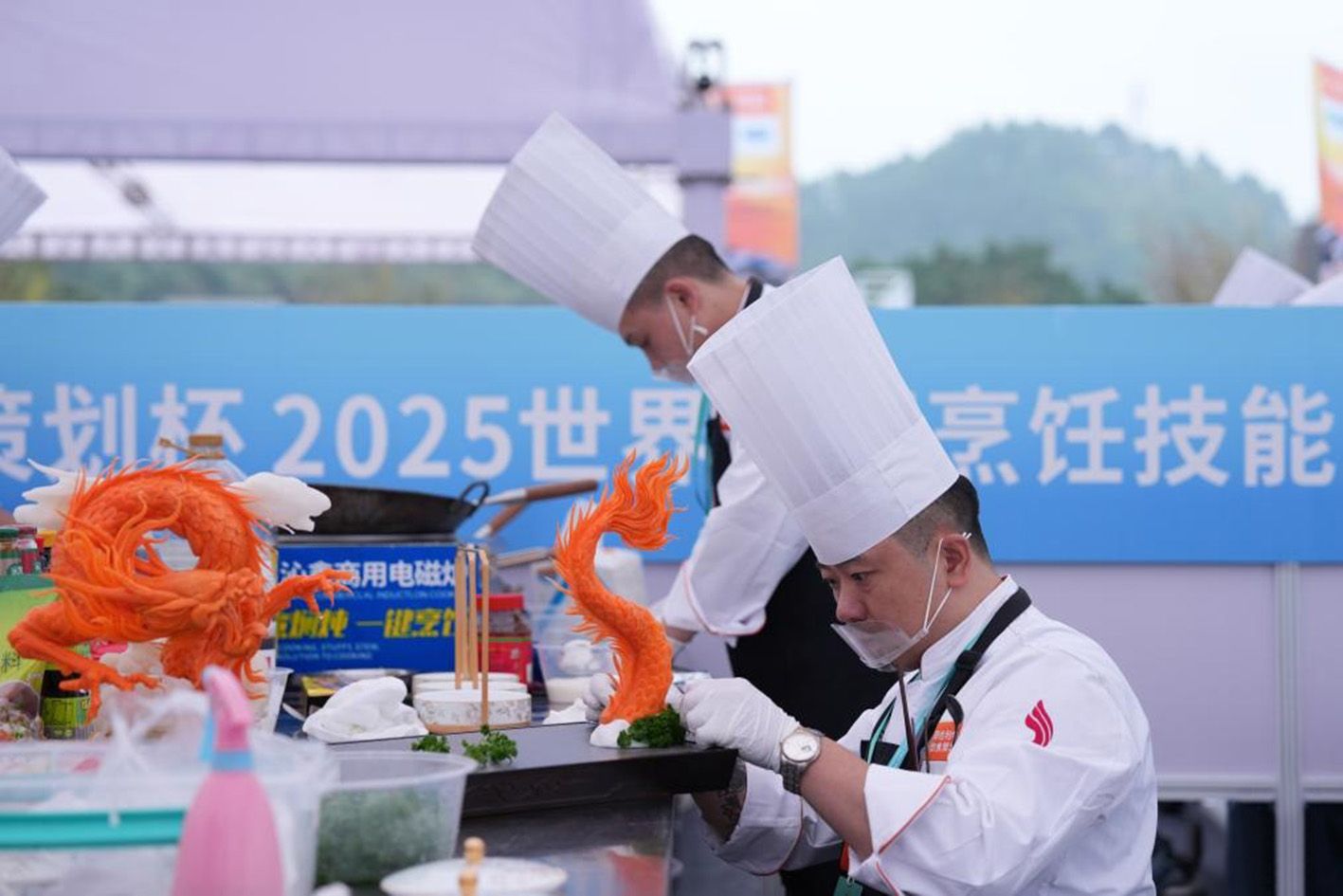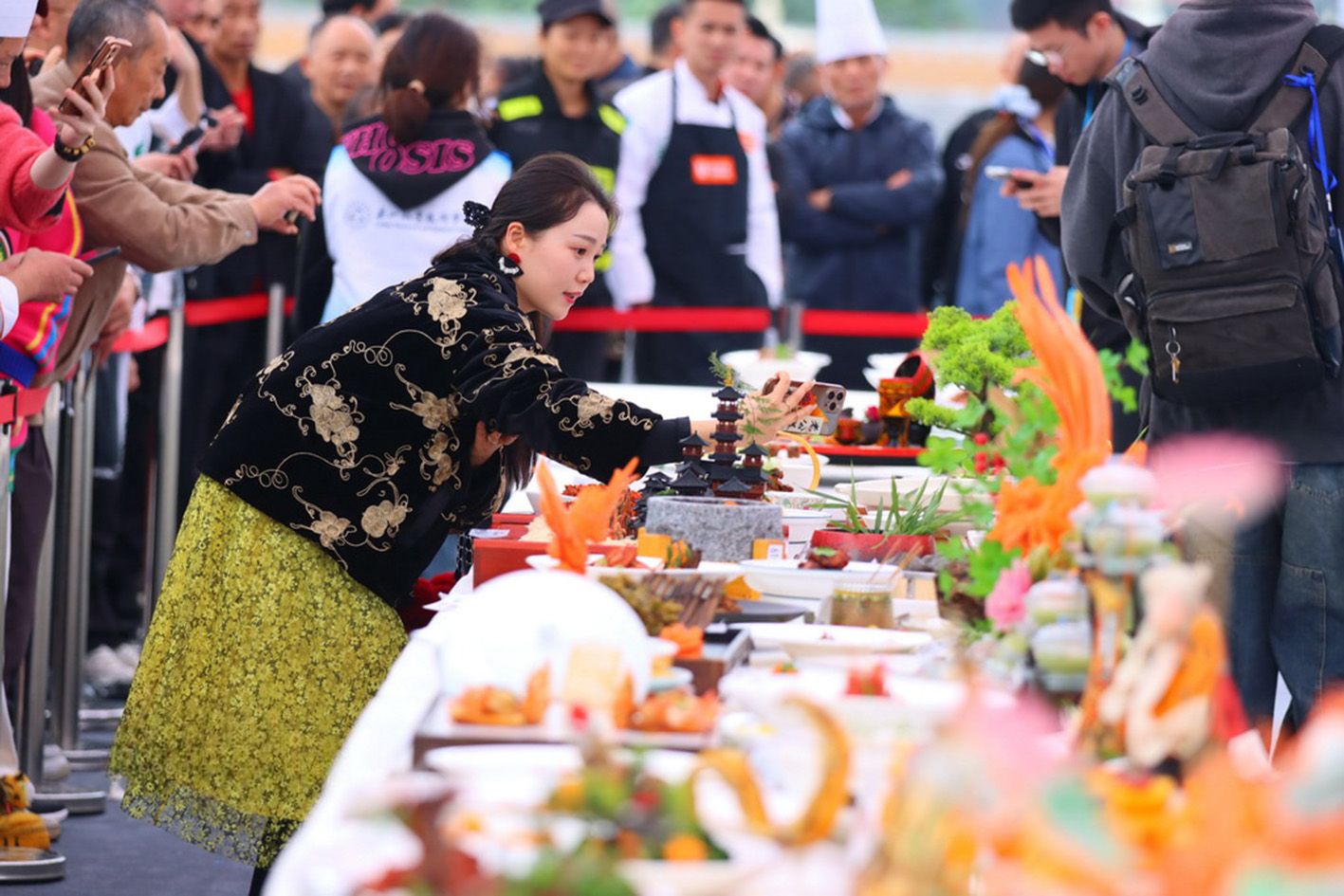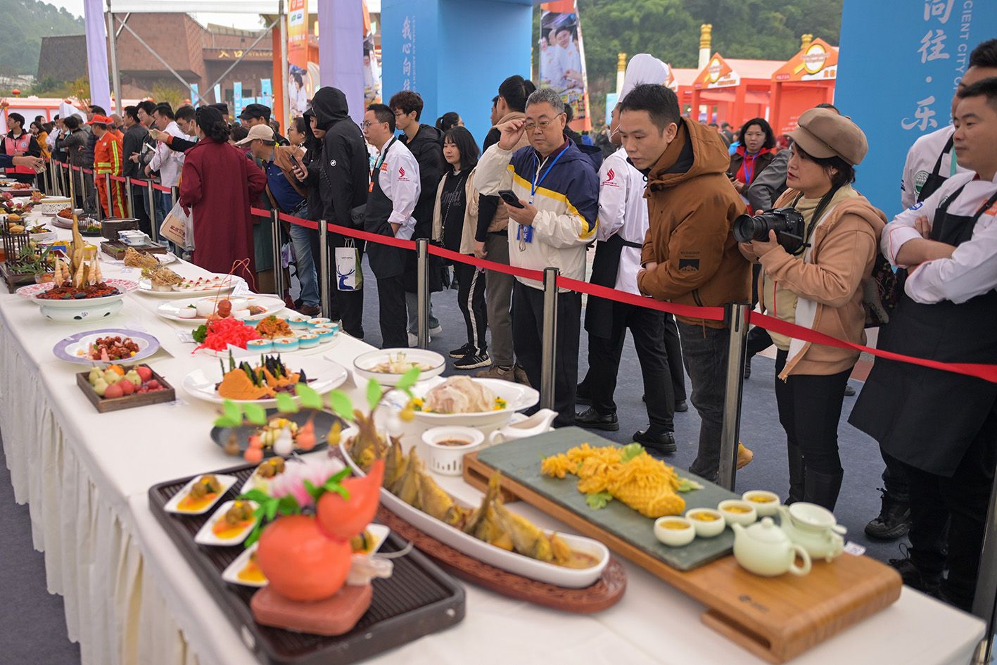 11月1日,2025世界川菜烹饪技能大赛在四川省乐山市大佛文化广场鸣锣开赛。来自全国各地的85支参赛团队、160余名川菜烹饪名厨大师,围绕指定热菜“豆瓣鱼”、自选创意菜品、川味小吃三大主题,展开了一场关于川味技艺与风味的巅峰对决。图为川菜烹饪技能大赛现场,制作精美的创意菜品吸引民众观赏拍照。(中新社)
