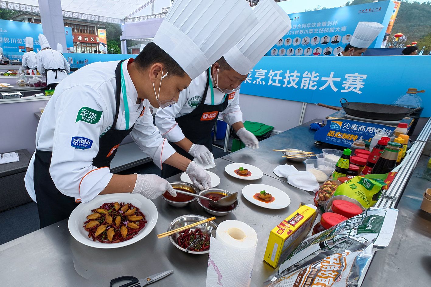 11月1日,2025世界川菜烹饪技能大赛在四川省乐山市大佛文化广场鸣锣开赛。图为比赛现场参赛厨师齐心协力完成菜品制作。(中新社)