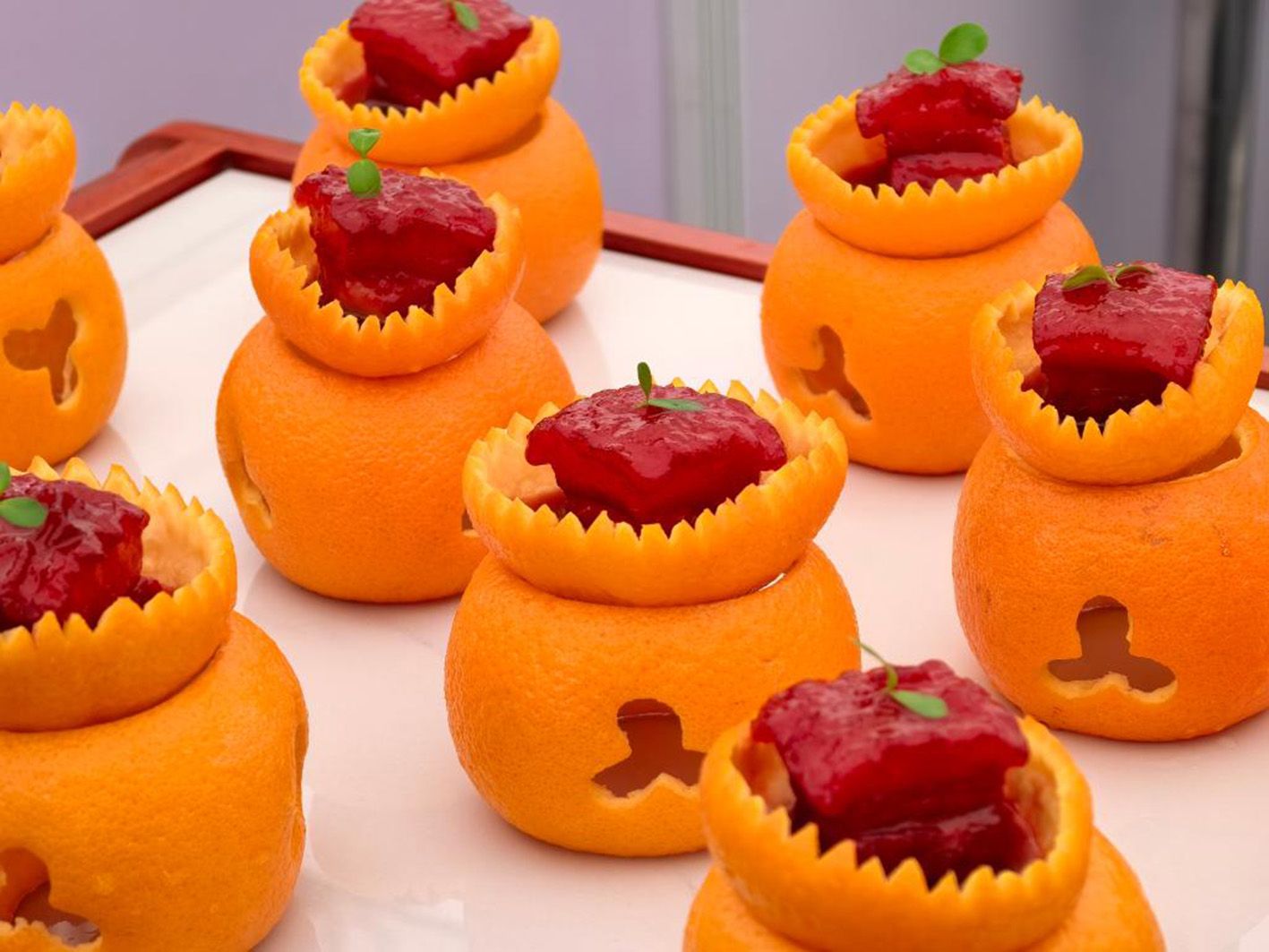在2025世界川菜烹饪技能大赛现场,“橙香方肉”新鲜出炉。(新华社)
