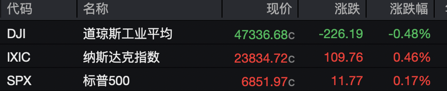 当地时间11月3日(周一),美股三大指数涨跌不一,纳指涨0.46%,标普500指数涨0.17%,道指跌0.48%。亚马逊与OpenAI签署380亿美元算力供应协议的消息推动公司股价走高,刷新历史纪录。