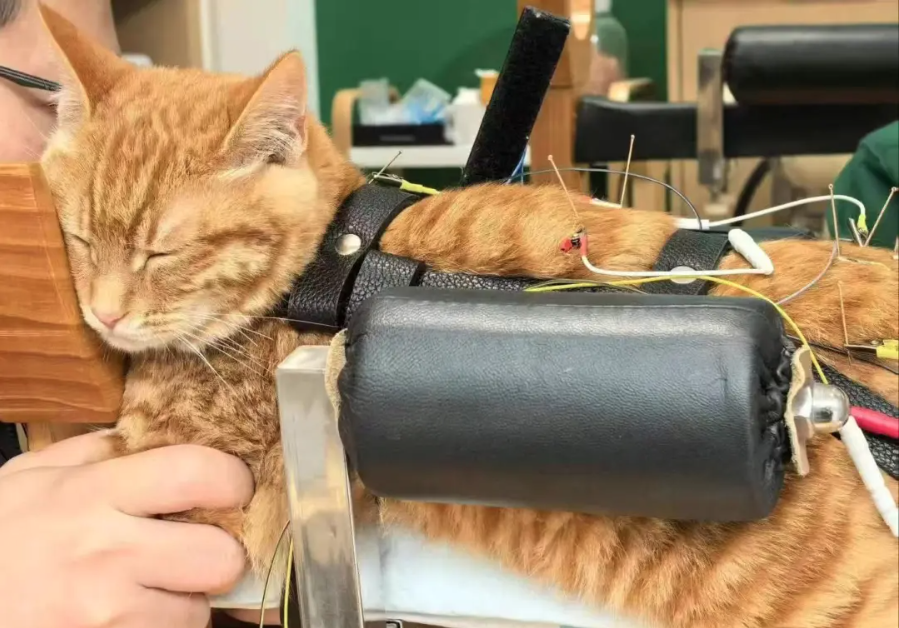兽医师王苇俯身,将数根细如发丝的银针刺入法斗背部的穴位,部分银针连接电针仪,他又轻旋旋钮,调整强度。“不太疼,针感类似蚊虫叮咬,动物大多能安静接受。”他一边操作,一边向一旁的学生解释道,“宠物与人的针灸基础理论相通。研究证实,针刺穴位可让机体产生内源性的镇痛、抗炎或促进血液循环等疗效,电刺激则能增强这一效果。”