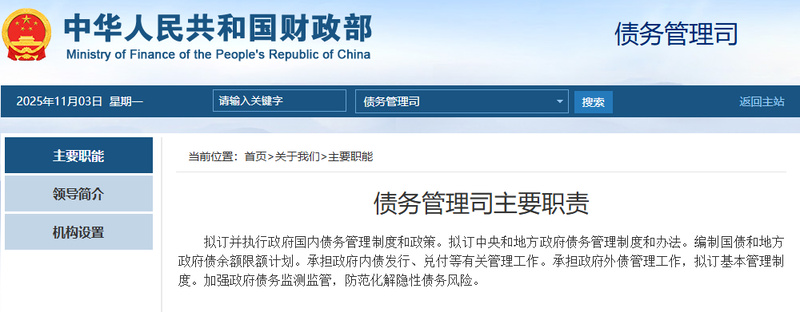 官网介绍,债务管理司主要职责包括:拟订并执行政府国内债务管理制度和政策。拟订中央和地方政府债务管理制度和办法。编制国债和地方政府债余额限额计划。承担政府内债发行、兑付等有关管理工作。承担政府外债管理工作,拟订基本管理制度。加强政府债务监测监管,防范化解隐性债务风险。