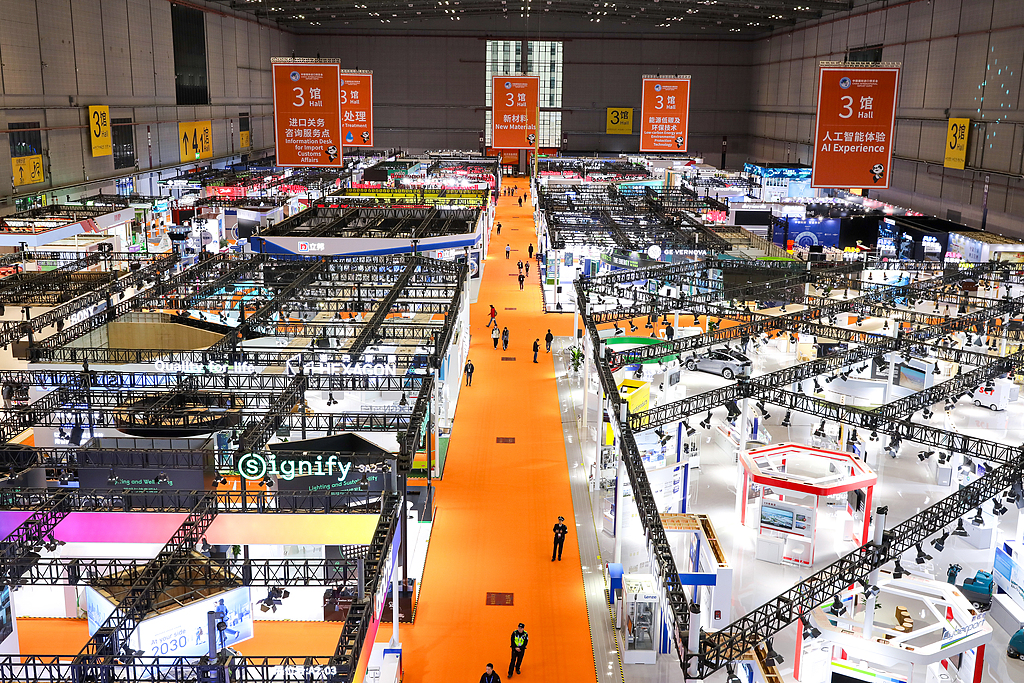 11月3日,进博会各场馆布展工作进入收尾阶段。图为人工智能体验区。(视觉中国)