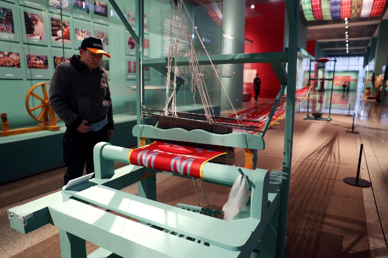 2025年11月5日,参观者在展厅现场观看艾德莱斯绸的制作技艺。(图/黎明 摄)