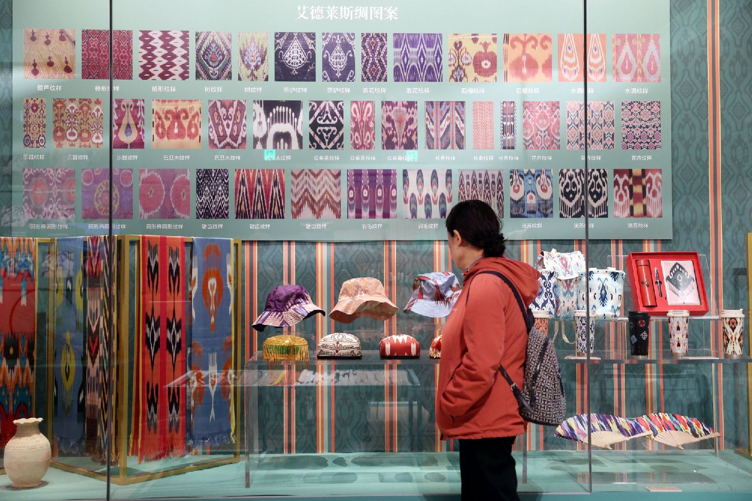 2025年11月5日,参观者被众多艾德莱斯绸纹案吸引驻足。(图/黎明 摄)