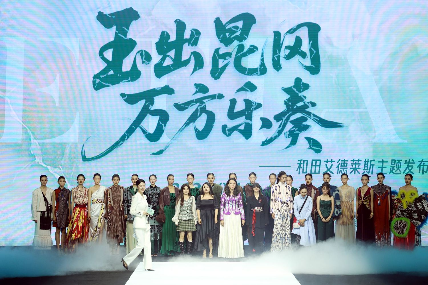 2025年9月13日,来自和田的设计师茹仙古丽·买买提艾力(前排右四)带着设计的艾德莱斯绸服饰参加大秀。(图/黎明 摄)