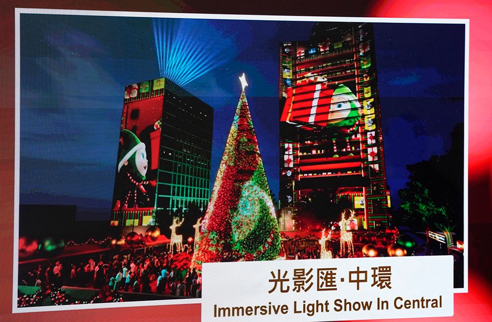 “光影汇·中环”则于本月28日至明年1月4日举行,由环绕“圣诞天地”的中银及汇丰总行大厦等八大地标建筑首度携手合作,化身为巨型光影画布,透过3D投影技术、灯光效果并配合节日音乐,展现多变立体的圣诞影像,包括天使、雪人、驯鹿、礼物等节庆图案。