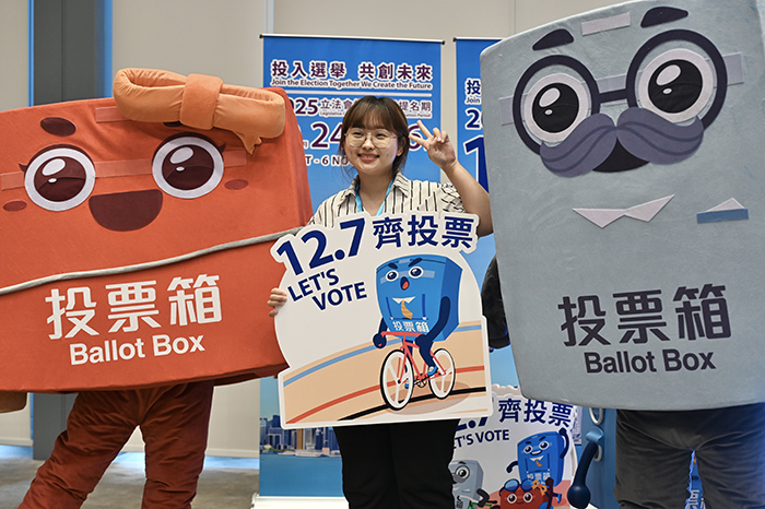 10月23日,香港特区政府和选举管理委员会举行2025年立法会换届选举启动礼,为第八届立法会选举揭开序幕。图为一名女士与“票箱家族”角色合影。(图/中新社)
