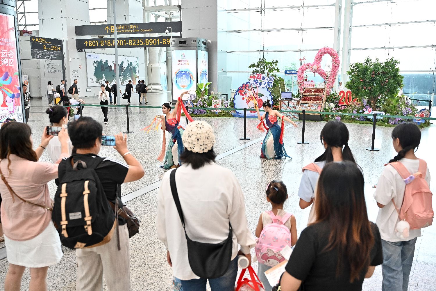 7月31日,舞蹈演员在广州白云机场T1航站楼内起舞,吸引旅客观赏。当日,广州白云机场举办“国风舞韵·情满暑运”快闪活动,11支国风与现代交融的精彩舞蹈,为旅客的暑运之旅增添一抹文化亮色。(图/中新社)