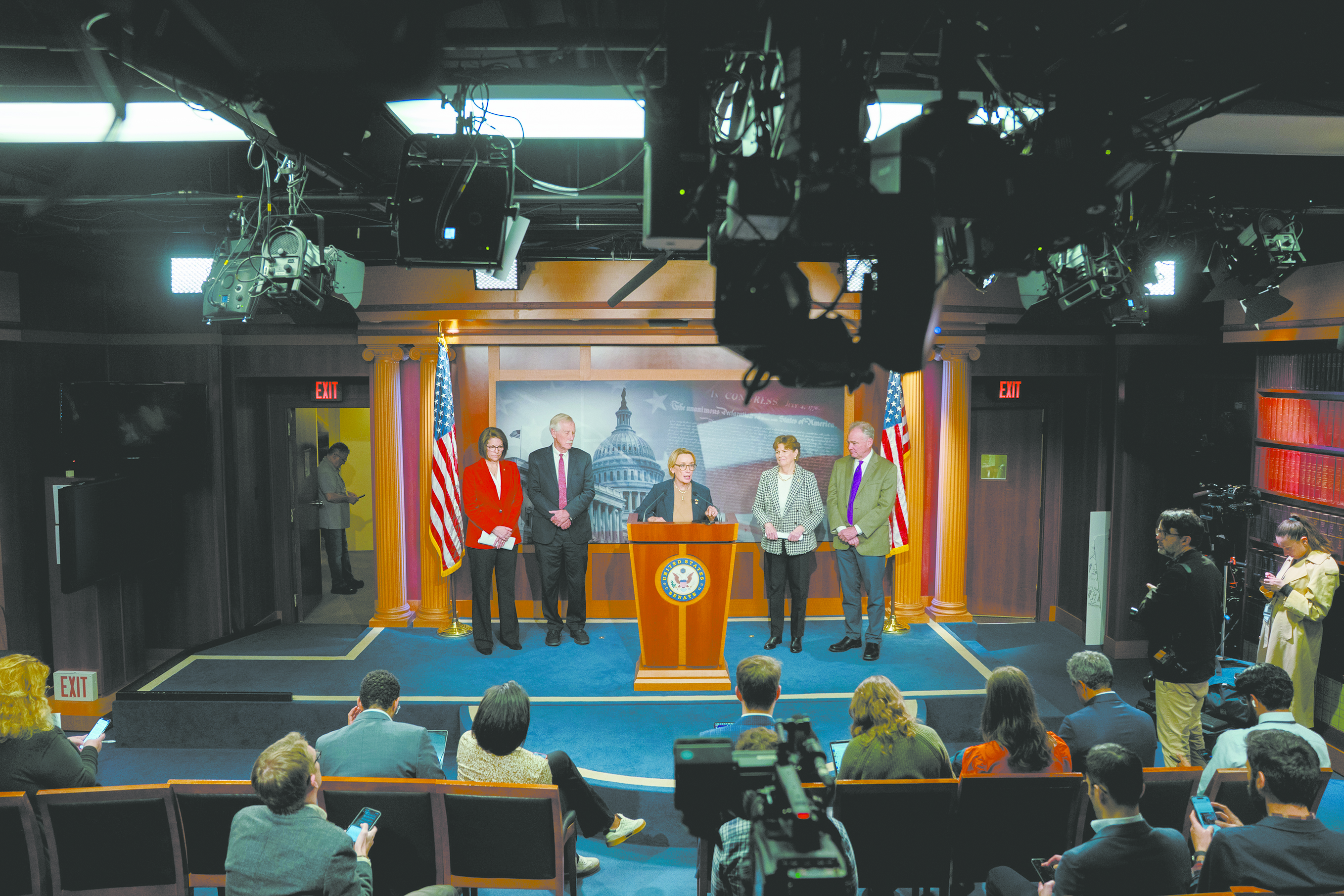 当地时间11月9日,一些温和派民主党参议员同意推进联邦政府临时拨款法案,为结束美国政府创纪录的停摆迈出重要一步。图为民主党参议员在投票当天举行新闻发布会。(视觉中国)