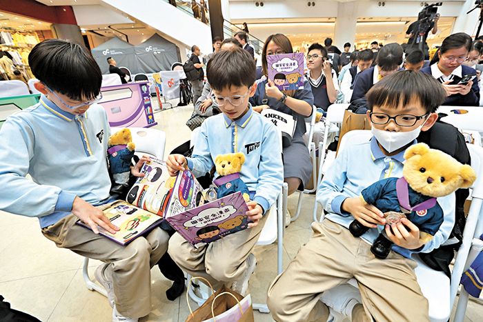 香港特区政府保安局将国家安全动漫《安仔与熊仔》改编成互动剧场。图为早前学生获发《安仔与熊仔》。 (图/香港《文汇报》)