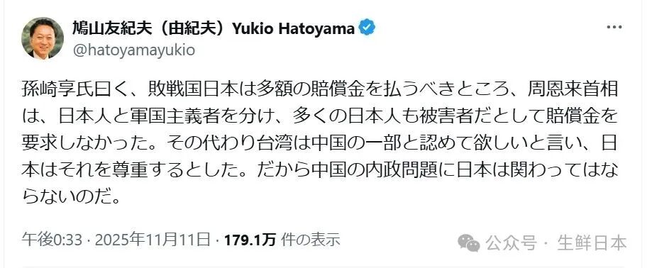 鸠山由纪夫在社交平台X(旧称Twitter)上发文:「据孙崎享(知名日本外交官)所言,战败国日本理应支付巨额赔款,但中国的周恩来总理区分了日本人和军国主义者,并未要求赔款,理由是许多日本人也是受害者。作为代价,他要求承认台湾是中国的一部分,日本对此表示尊重。因此,日本不应干涉中国内政问题。」