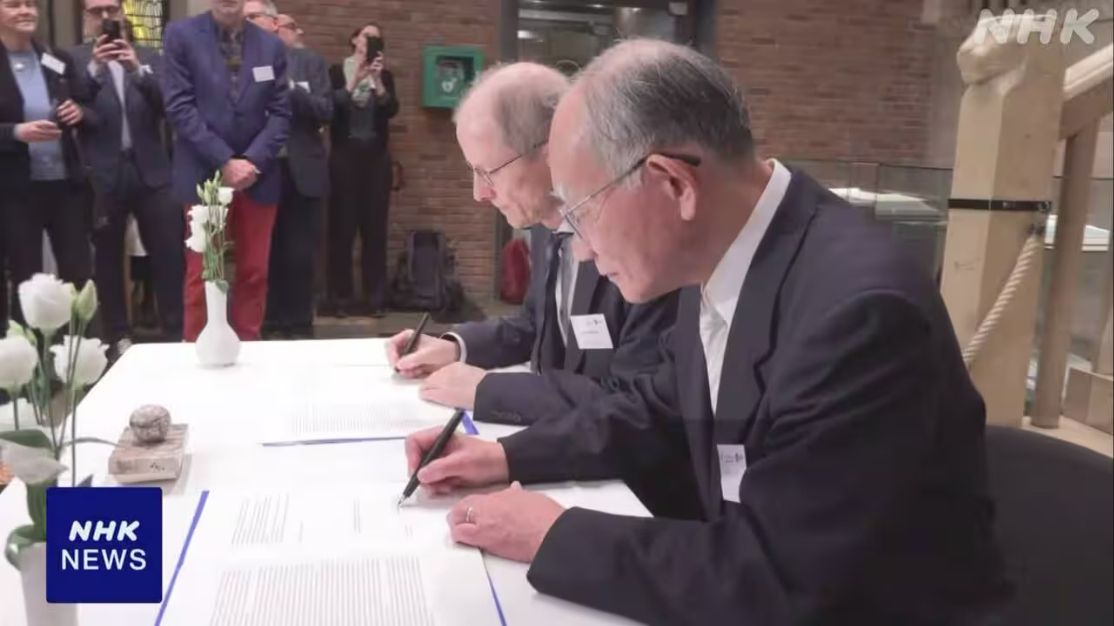 签署仪式于日本时间15日凌晨0时在德国西部城市明斯特市政厅举行,日本物理学会会长宫下精二、德国物理学会会长克劳斯·里希特等人出席。