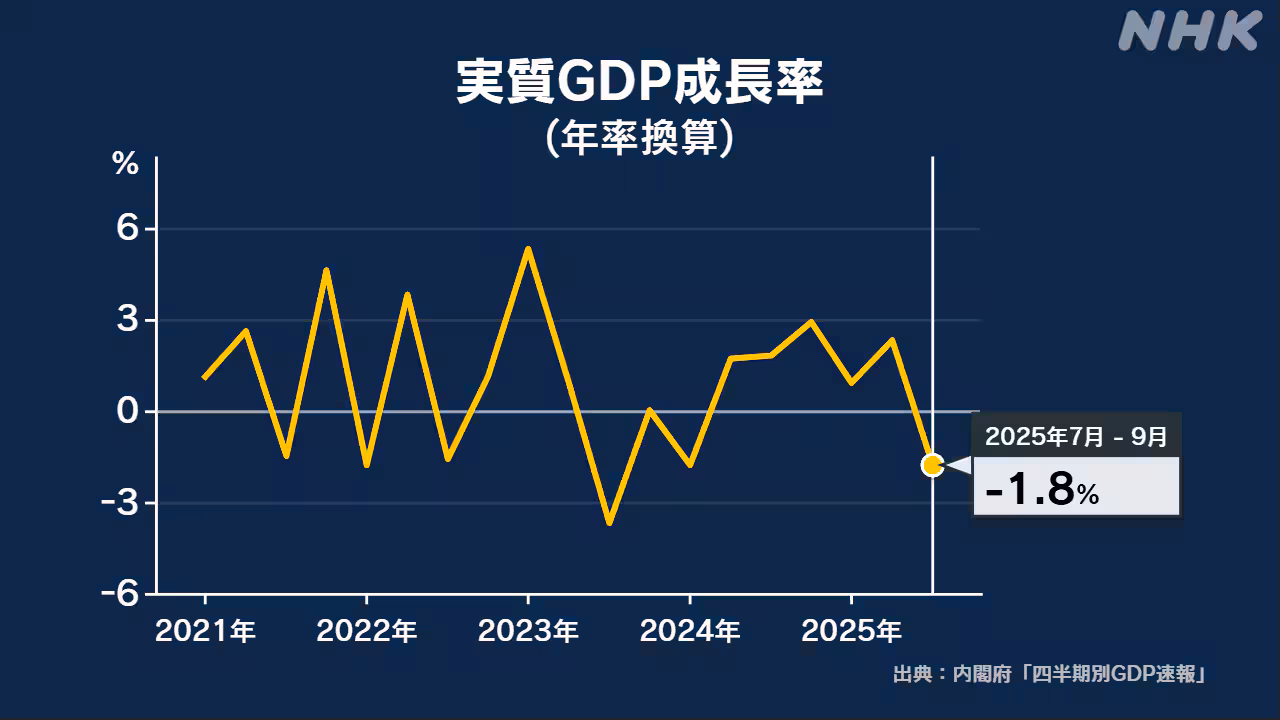 (亚太快讯消息)据NHK报道,今年7月至9月的日本国内生产总值(GDP)与此前3个月相比,按实际年率换算下降了 1.8%,为 6个季度以来首次负增长。主要原因是美国关税措施导致出口减少等因素所致。