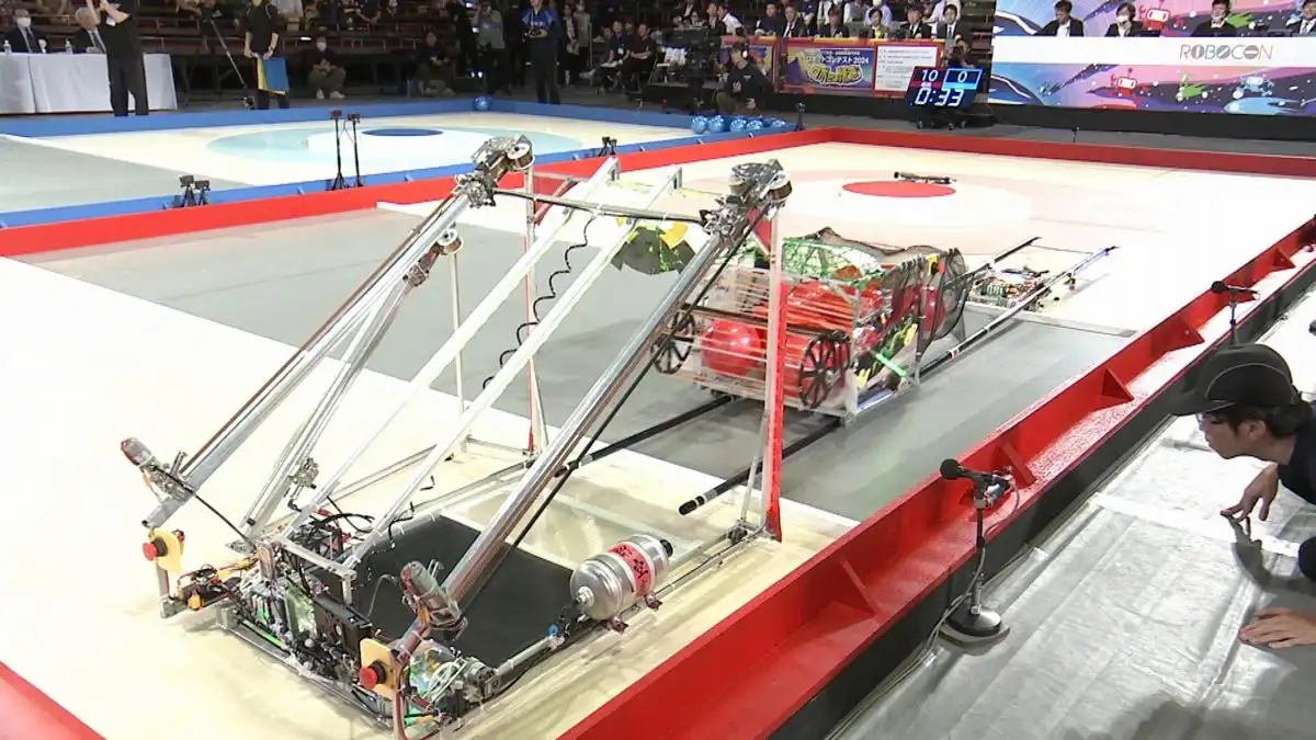 这项赛事由日本全国高等专门学校(高专)及NHK等机构每年联合举办。本次在国技馆的赛场上,汇集了从各地区预赛中脱颖而出的25支队伍。比赛主题为“Great High Gate(伟大的高门)”。参赛队伍需在3分钟的时间限制内操控机器人堆叠箱体构筑“门”,并让机器人以及载人的小车顺利通过所搭建的“门”。完成“门”、让机器人或小车成功通过等都会获得积分。随着比赛的激烈推进,观众席上掌声与欢呼不断。在决赛中,“旭川高专”与“熊本高专(熊本校区)”展开对决。“旭川高专”凭借灵活的小型机器人与小车,多次顺利通过“门”不断累积积分,最终夺得冠军。此外,颁发给创意最优秀团队的“机器人竞赛大奖”,由本次比赛成功搭建起最高、达4.2米“门”的“熊本高专(熊本校区)”获得。在颁奖典礼上,“熊本高专(熊本校区)”队长松永苍真表示:“能够展现出我们的最佳表现,并获颁大奖,真的非常高兴。”