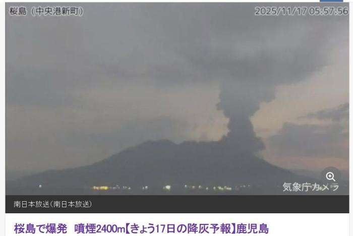 中新网11月17日电据日本“南日本放送”援引日本气象厅的消息,当地时间17日凌晨5时54分,日本樱岛南岳山顶火山口发生爆炸性喷发。