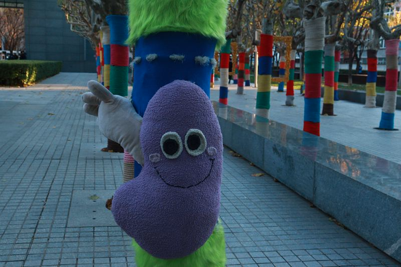 当地时间11月17日上午,寒风吹得树叶摇晃,路人们冷得把脖子缩在衣领,行色匆匆。在海淀区中关村南三街附近,路边小广场透出五颜六色的色彩,一排排梧桐树裹着彩色的限定款毛衣,像卫兵一样整齐排列。梧桐树的树干上,彩色棉麻线层层叠叠,明黄撞色宝蓝,玫粉色叠加奶白色,一圈圈麻线里还藏着毛茸茸的绒球、粉花,有棵树的“袖口”处还“长”出了一个瞪圆眼睛的绿色星星玩偶,仿佛举着白手套朝路人挥手。