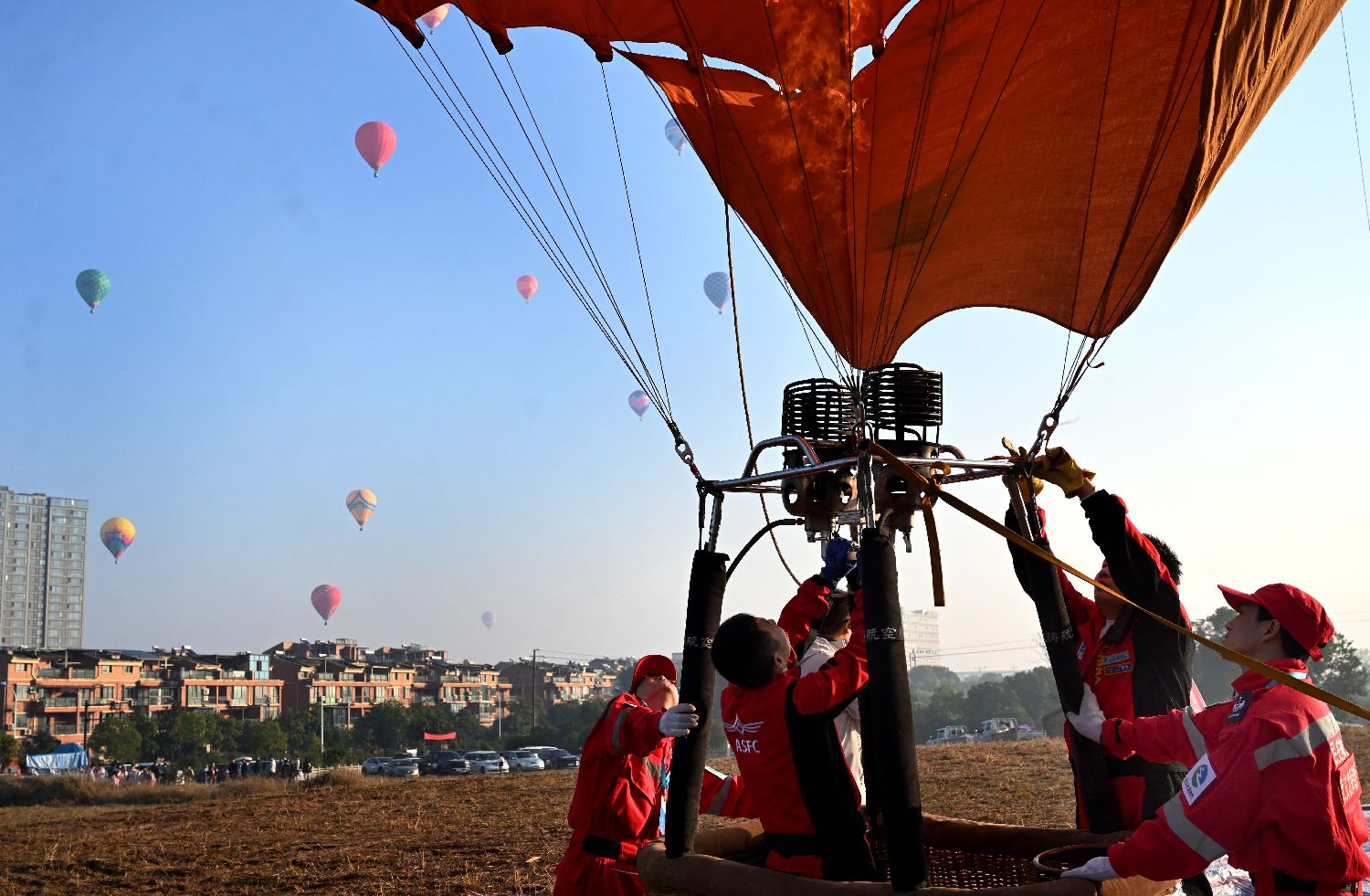 11月16日,参加热气球比赛的选手在浙江省金华市武义县上空进行各科目的飞行竞技。(中新社)
