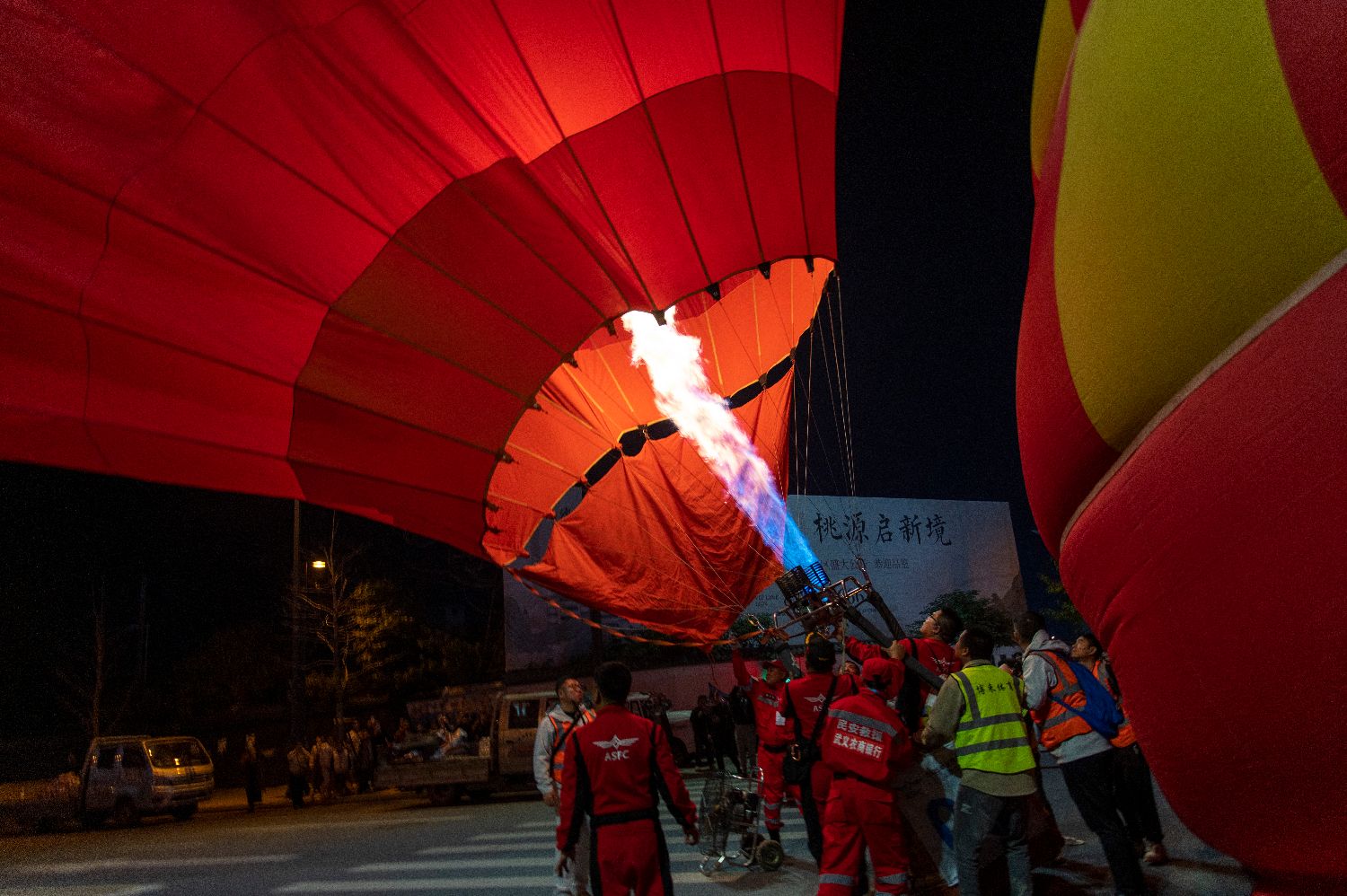 11月17日,浙江省金华市武义古城,热气球比赛选手进行喷火巡游。(CFP)