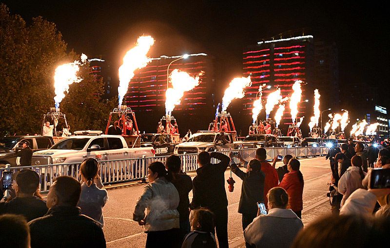 11月17日,随着引擎低吼与火焰轰鸣交织,30辆搭载尖端喷火设备的巡游车队化作一条“移动火龙”,从温泉大道向解放桥一路游行,当近3米高的焰柱从车顶骤然喷涌,橘红色的火舌瞬间舔舐夜空,暖光如潮水般漫过沿街人群。暗夜里炸开的光团中,孩子们踮脚惊呼,成年人举着手机追拍,火焰所到之处轰鸣不断、民众热情高涨。(武义发布微信公众号)