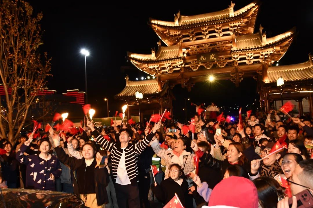 11月17日,“喷火”巡游行至古城路段,一场充满惊喜的快闪活动骤然拉开帷幕。《你要跳舞吗》《相亲相爱》《逆战》《我的祖国》等歌曲轮番上阵,围观民众瞬间被点燃热情,大家随着节奏拍手哼唱,舞动身体,手中的小旗在焰光映照下化作点点星火,欢呼声、歌声与火焰的轰鸣交织共振,暖光、红旗、笑脸相映成趣,将整场巡游的热烈氛围推向顶峰。(武义发布微信公众号)