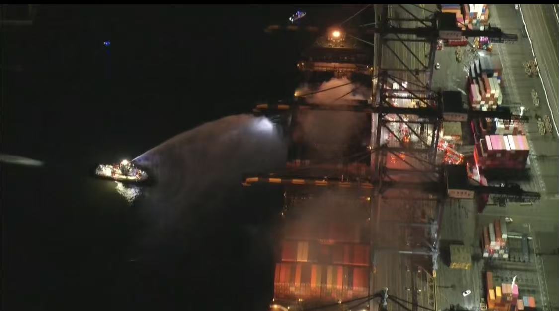 当地时间11月21日,美国洛杉矶市市长卡伦·巴斯证实,当天傍晚18时30分过后不久,洛杉矶港一艘集装箱船的甲板下方发生电气火灾,超过100名消防员已前往现场灭火。
