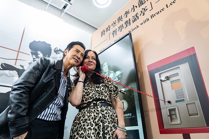 图为李小龙基金会创办人兼会长、李小龙之女李香凝(右)和动作影视明星甄子丹在展览的“电话亭”互动区域聆听李小龙的声音。(图/中新社)