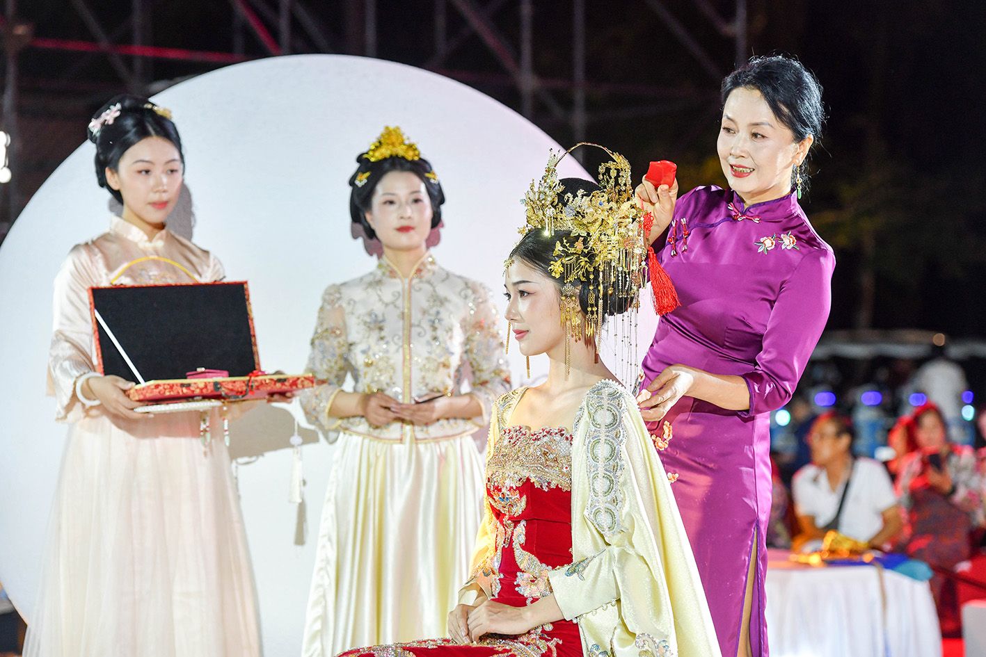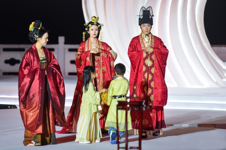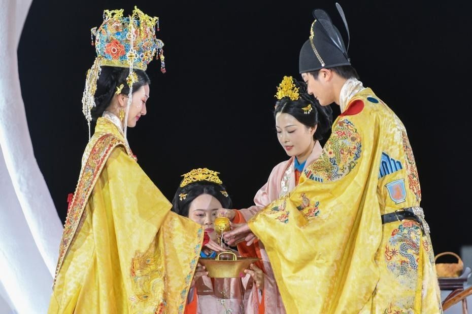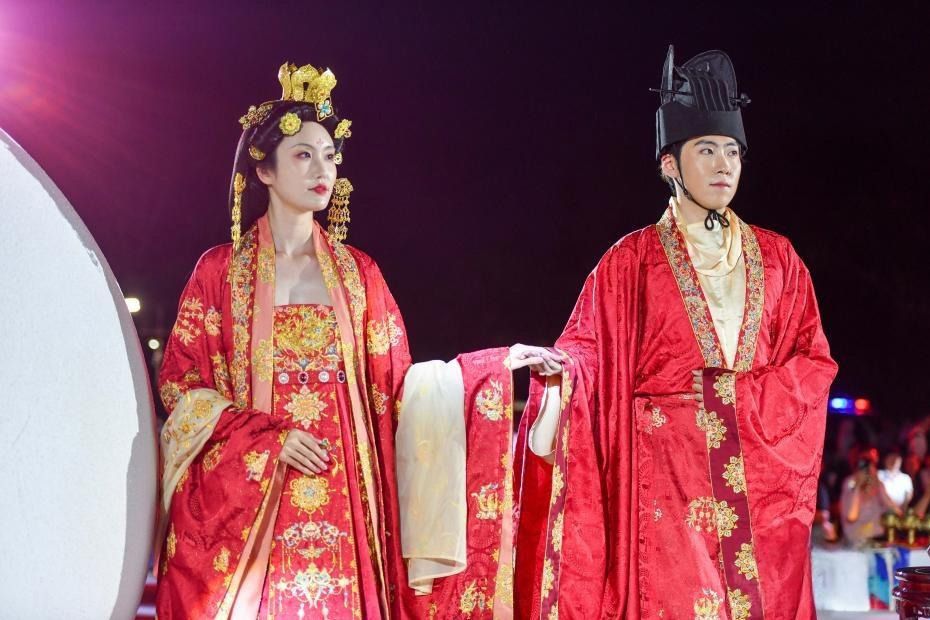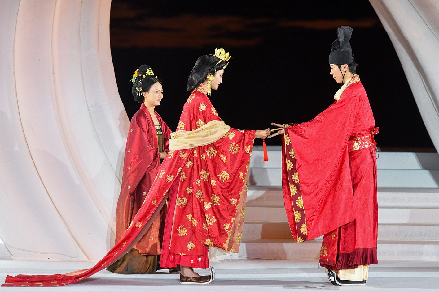 演出以时间为脉络,依次呈现唐代婚俗秀、明代婚俗秀、新中式婚俗秀与西式婚俗秀四个篇章,穿插主题舞蹈与情景演绎,生动展现不同时代、不同风格的婚俗文化演变。(中国日报网)