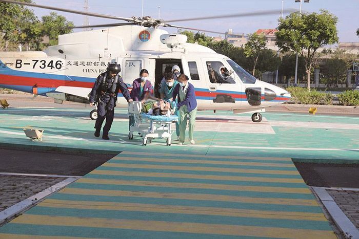 直升机平稳降落在厦门大学附属翔安医院停机坪,患者被在此等候的医护团队迅速接诊。(图/台海网)
