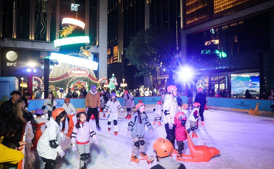 BFC北区广场ICE FAMILY外滩冬日滑冰场惊喜开放,300平方米赛事级专业冰面静待驰骋,搭配沉浸式灯光表演与人工飘雪,打造外滩边上的冰雪童话世界。(上海《解放日报》)