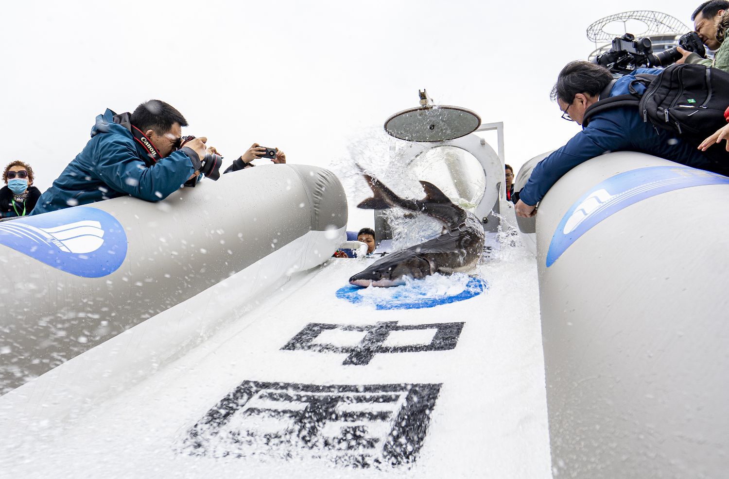 资料图为一尾大规格“子二代”中华鲟在长江珍稀鱼类放流点放归长江。(图/中新社)