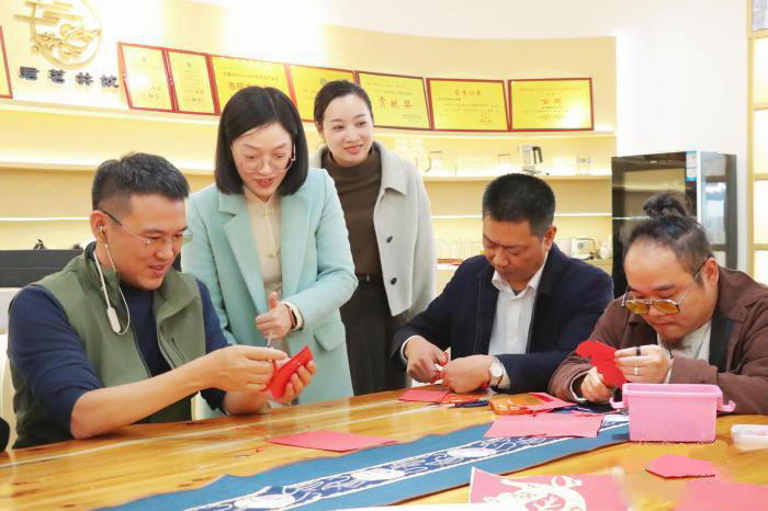 11月27日,非遗体验——茶韵流芳暨剪艺传情活动在福建省宁德市举行。图为剪纸技艺互动。(图/中新网)